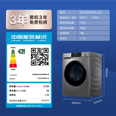 [换新补贴]海尔滚筒洗衣机家用全自动超薄10kg大容量洗烘39plus