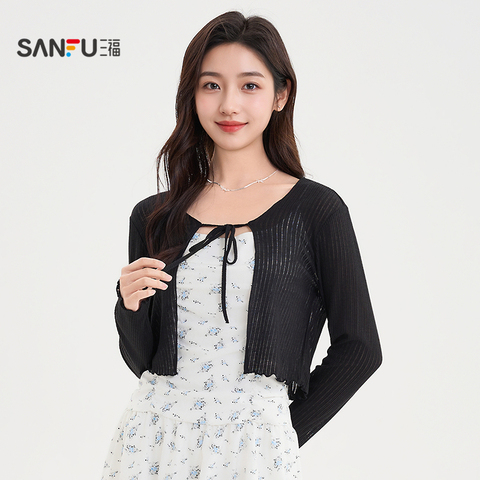 三福开衫女2025新款夏季系带圆领针织披肩小个子短款外套上衣女装